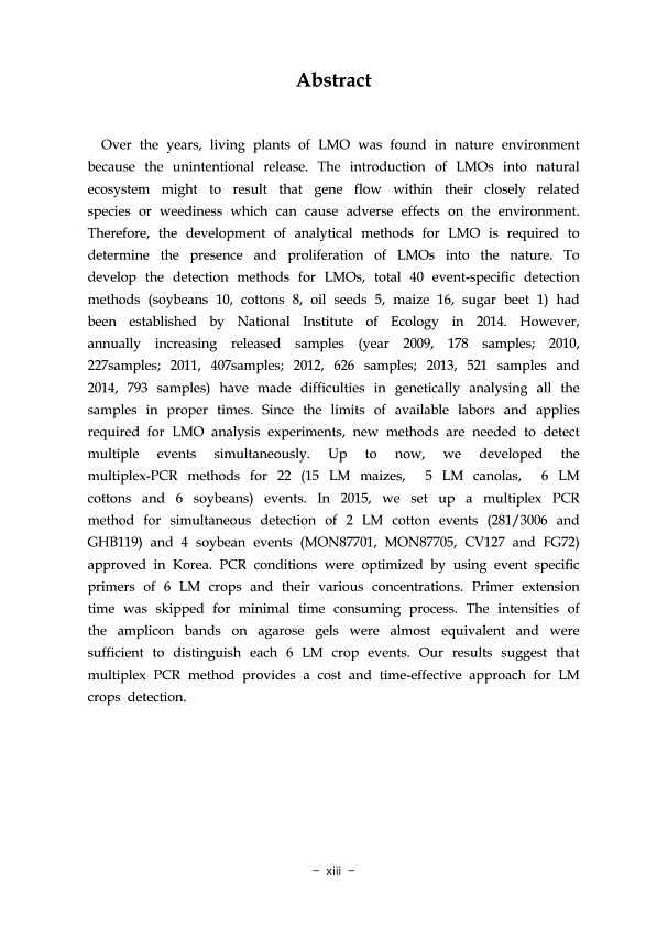 제목 : 유전자재조합생물체(LMO)의 동시 검출을 위한 multiplex-PCR법 개발(III)