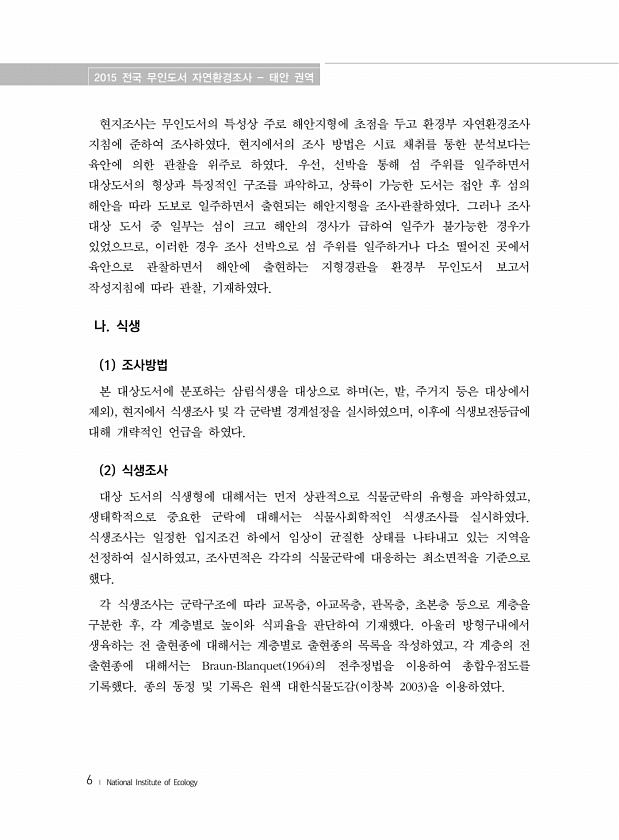 2015 전국 무인도서 자연환경조사 태안 권역 6 ? National Institute of Ecology 현지조사는 무인도서의 특성상 주로 해안지형에 초점을 두고 환경부 자연환경조사 지침에 준하여 조사하였다. 현지에서의 조사 방법은 시료 채취를 통한 분석보다는 육안에 의한 관찰을 위주로 하였다. 우선, 선박을 통해 섬 주위를 일주하면서 대상도서의 형상과 특징적인 구조를 파악하고, 상륙이 가능한 도서는 접안 후 섬의 해안을 따라 도보로 일주하면서 출현되는 해안지형을 조사?관찰하였다. 그러나 조사 대상 도서 중 일부는 섬이 크고 해안의 경사가 급하여 일주가 불가능한 경우가 있었으므로, 이러한 경우 조사 선박으로 섬 주위를 일주하거나 다소 떨어진 곳에서 육안으로 관찰하면서 해안에 출현하는 지형경관을 환경부 무인...