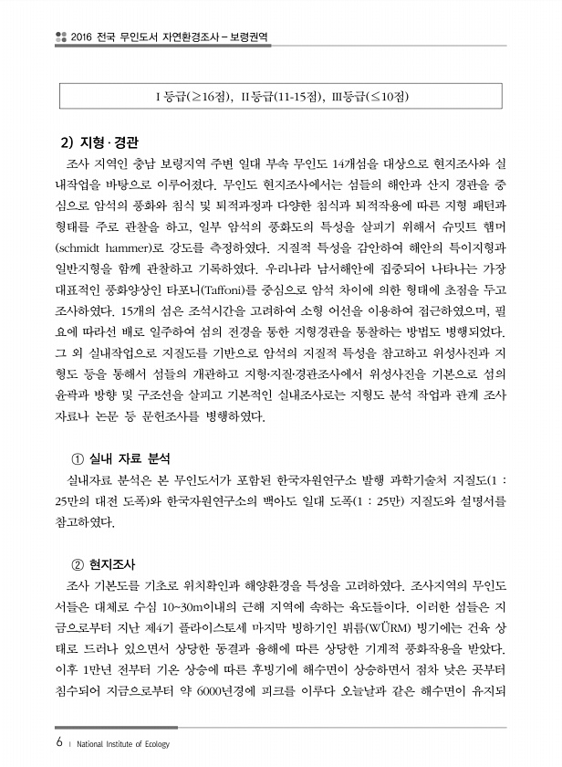 2016 전국 무인도서 자연환경조사 보령권역 6 ? National Institute of Ecology Ⅰ등급 ≥16점 , Ⅱ등급 11-15점 , Ⅲ등급 ≤10점 2 지형 ? 경관 조사 지역인 충남 보령지역 주변 일대 부속 무인도 14개섬을 대상으로 현지조사와 실 내작업을 바탕으로 이루어졌다. 무인도 현지조사에서는 섬들의 해안과 산지 경관을 중 심으로 암석의 풍화와 침식 및 퇴적과정과 다양한 침식과 퇴적작용에 따른 지형 패턴과 형태를 주로 관찰을 하고, 일부 암석의 풍화도의 특성을 살피기 위해서 슈밋트 햄머 schmidt hammer 로 강도를 측정하였다. 지질적 특성을 감안하여 해안의 특이지형과 일반지형을 함께 관찰하고 기록하였다. 우리나라 남서해안에 집중되어 나타나는 가장 대표적인 풍화양상인 타포니 T...