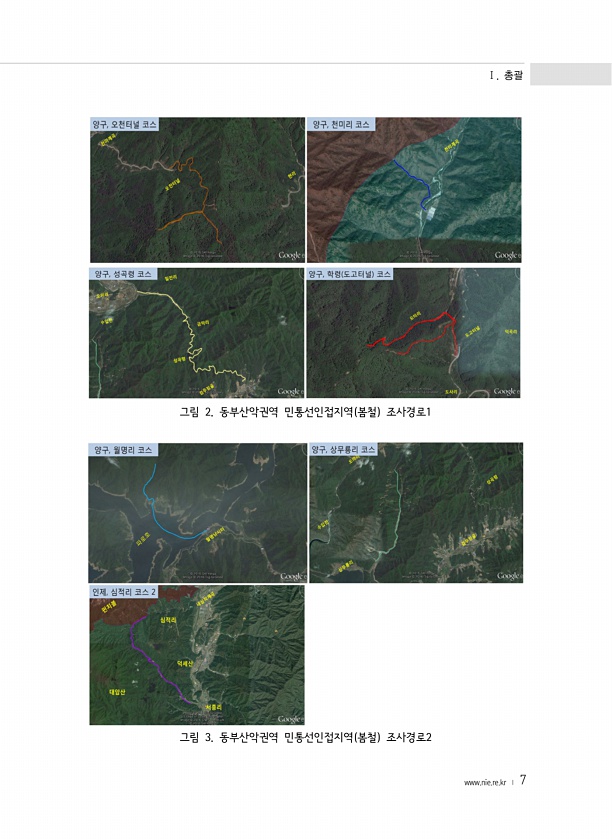 Ⅰ. 총괄 www.nie.re.kr ? 7 그림 2. 동부산악권역 민통선인접지역 봄철 조사경로1 그림 3. 동부산악권역 민통선인접지역 봄철조사경로2