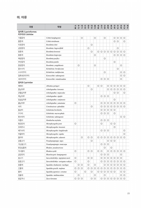 15 마. 어류 국명 학명 서 울 부산 대구 인천 광주 대전 울산 세종 경기 강원 충북 충남 전북 전남 경북 경남 제주 잉어목 Cypriniformes 미꾸리과 Cobitidae 기름종개 Cobitis hangkugensis ○ ○ ○ ○ ○ ○ ○ 줄종개 Cobitis tetralineata ○ ○ ○ 미호종개 Iksookimia choii ○ 남방종개 Iksookimia hugowolfeldi ○ ○ 참종개 Iksookimia koreensis ○ ○ ○ ○ ○ ○ ○ ○ ○ ○ 왕종개 Iksookimia longicorpa ○ ○ ○ ○ ○ 북방종개 Iksookimia pacifca ○ 부안종개 Iksookimia pumila ○ 동방종개 Iksookimia yongdokensis ○ ○ ○ 좀수수치 ...