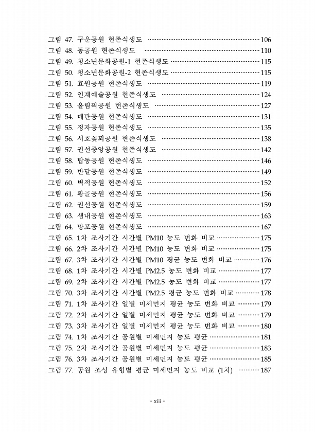 xiii 그림 구운공원 현존식생도 그림 동공원 현존식생도 그림 청소년문화공원 현존식생도 그림 청소년문화공원 현존식생도 그림 효원공원 현존식생도 그림 인계예술공원 현존식생도 그림 올림픽공원 현존식생도 그림 매탄공원 현존식생도 그림 정자공원 현존식생도 그림 서호꽃뫼공원 현존식생도 그림 권선중앙공원 현존식생도 그림 탑동공원 현존식생도 그림 반달공원 현존식생도 그림 벽적공원 현존식생도 그림 황골공원 현존식생도 그림 권선공원 현존식생도 그림 샘내공원 현존식생도 그림 망포공원 현존식생도 그림 차 조사기간 시간별 농도 변화 비교 그림 차 조사기간 시간별 농도 변화 비교 그림 차 조사기간 시간별 평균 농도 변화 비교 그림 차 조사기간 시간별 농도 변화 비교 그림 차 조사기간 시간별 농도 변화 비교 그림 차 조사기간 시간별...