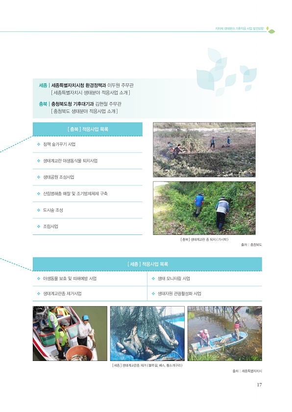 [ 세종 ] 생태계교란종 제거 블루길, 베스, 황소개구리 [ 세종 ] 적응사업 목록 ? 야생동물 보호 및 피해예방 사업 ? 생태 모니터링 사업 ? 생태계교란종 제거사업 ? 생태자원 관광활성화 사업 [ 충북 ] 적응사업 목록 ? 정책 숲가꾸기 사업 ? 생태계교란 야생동식물 퇴치사업 ? 생태공원 조성사업 ? 산림병해충 예찰 및 조기방제체제 구축 ? 도시숲 조성 ? 조림사업 [ 충북 ] 생태계교란 종 퇴치 가시박 출처 세종특별자치시 출처 충청북도 세종┃세종특별자치시청 환경정책과 이두원 주무관 [ 세종특별자치시 생태분야 적응사업 소개 ] 충북┃충청북도청 기후대기과 김현철 주무관 [ 충청북도 생태분야 적응사업 소개 ] 지자체 생태분야 기후적응 사업 발전방향17