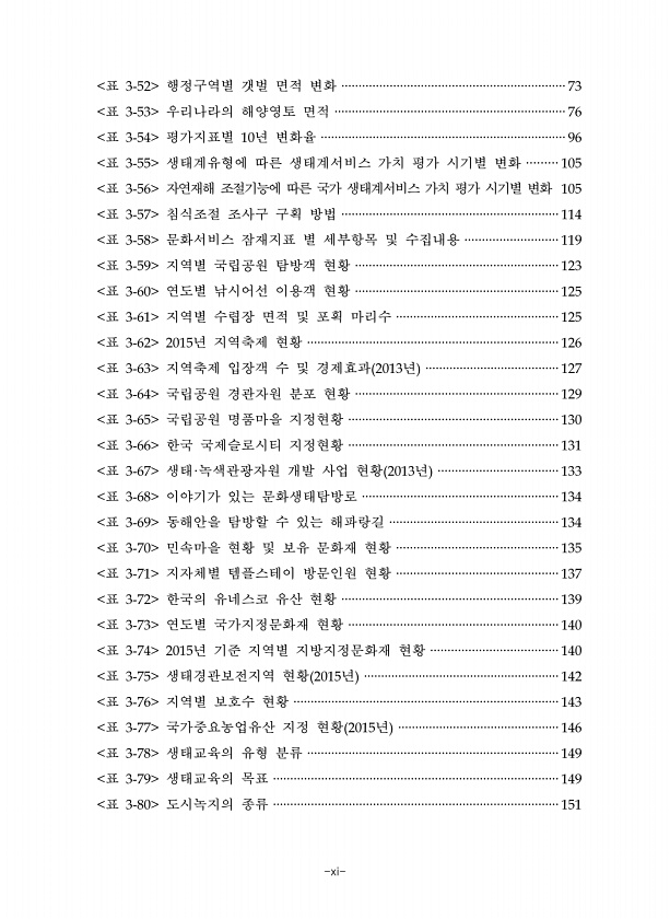 -xi- 표 행정구역별 갯벌 면적 변화 표 우리나라의 해양영토 면적 표 평가지표별 년 변화율 표 생태계유형에 따른 생태계서비스 가치 평가 시기별 변화 표 자연재해 조절기능에 따른 국가 생태계서비스 가치 평가 시기별 변화 표 침식조절 조사구 구획 방법 표 문화서비스 잠재지표 별 세부항목 및 수집내용 표 지역별 국립공원 탐방객 현황 표 연도별 낚시어선 이용객 현황 표 지역별 수렵장 면적 및 포획 마리수 표 년 지역축제 현황 표 지역축제 입장객 수 및 경제효과 년 표 국립공원 경관자원 분포 현황 표 국립공원 명품마을 지정현황 표 한국 국제슬로시티 지정현황 표 생태 녹색관광자원 개발 사업 현황 년 표 이야기가 있는 문화생태탐방로 표 동해안을 탐방할 수 있는 해파랑길 표 민속마을 현황 및 보유 문화재 현황 표 지자체...