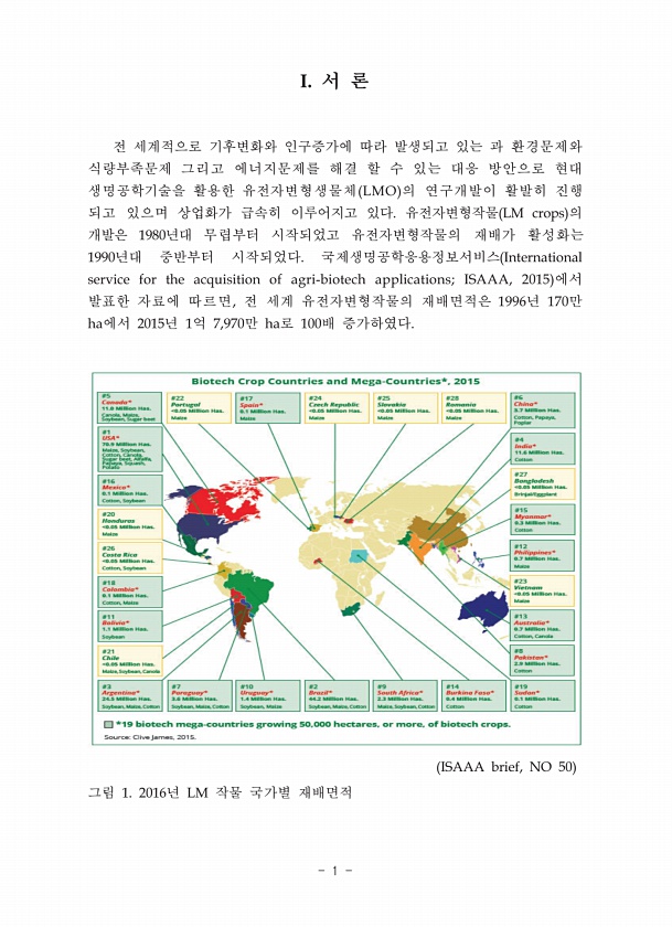 I. 서 론 전 세계적으로 기후변화와 인구증가에 따라 발생되고 있는 과 환경문제와 식량부족문제 그리고 에너지문제를 해결 할 수 있는 대응 방안으로 현대 생명공학기술을 활용한 유전자변형생물체 LMO 의 연구개발이 활발히 진행 되고 있으며 상업화가 급속히 이루어지고 있다. 유전자변형작물 LM crops 의 개발은 1980년대 무렵부터 시작되었고 유전자변형작물의 재배가 활성화는 1990년대 중반부터 시작되었다. 국제생명공학응용정보서비스 International service for the acquisition of agri-biotech applications; ISAAA, 2015 에서 발표한 자료에 따르면, 전 세계 유전자변형작물의 재배면적은 1996년 170만 ha에서 2015년 1억 7,970만 ha로 1...