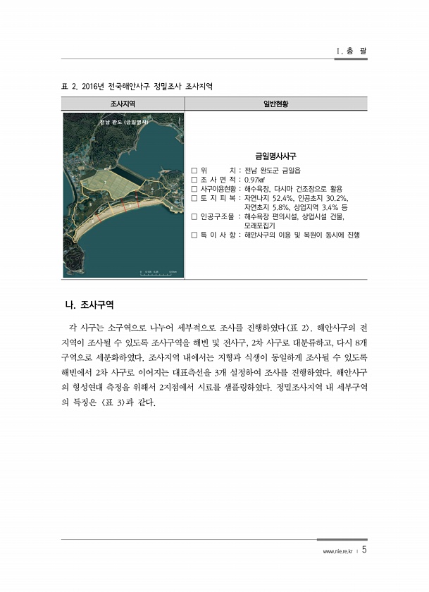 Ⅰ. 총 괄 www.nie.re.kr ? 5 조사지역 일반현황 금일명사사구 □ 위 치 전남 완도군 금일읍 □ 조 사 면 적 0.97㎢ □ 사구이용현황 해수욕장, 다시마 건조장으로 활용 □ 토 지 피 복 자연나지 52.4%, 인공초지 30.2%, 자연초지 5.8%, 상업지역 3.4% 등 □ 인공구조물 해수욕장 편의시설, 상업시설 건물, 모래포집기 □ 특 이 사 항 해안사구의 이용 및 복원이 동시에 진행 표 2. 2016년 전국해안사구 정밀조사 조사지역 나. 조사구역 각 사구는 소구역으로 나누어 세부적으로 조사를 진행하였다 표 2 해안사구의 전 지역이 조사될 수 있도록 조사구역을 해빈 및 전사구, 2차 사구로 대분류하고, 다시 8개 구역으로 세분화하였다. 조사지역 내에서는 지형과 식생이 동일하게 조사될 수 있도...