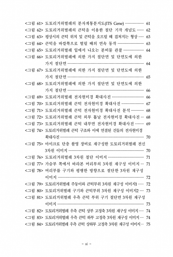 xi 그림 61 도토리거위벌레의 분자계통분지도 ITS Gene ··················· 61 그림 62 도토리거위벌레의 큰턱을 이용한 절단 기작 개념도 ······· 62 그림 63 평상시의 큰턱 위치 및 큰턱을 오므릴 때 겹쳐지는 형상····· 63 그림 64 큰턱을 바깥쪽으로 벌릴 때의 연속 동작 ··························· 63 그림 65 도토리거위벌레 입에서 나오는 분비물 관찰 ····················· 64 그림 66 도토리거위벌레에 의한 가지 절단면 및 단면도에 의한 가지 절단면 ··············································································· 64 그림 67 도토리거위벌레에 ...
