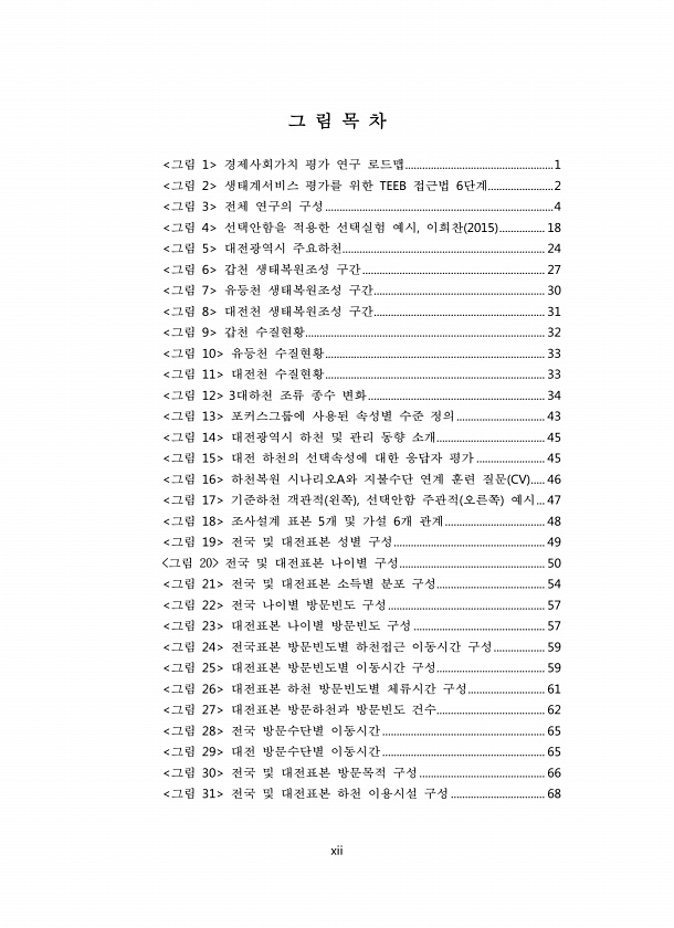 xii 그 림 목 차 그림 1 경제사회가치 평가 연구 로드맵....................................................1 그림 2 생태계서비스 평가를 위한 TEEB 접근법 6단계.......................2 그림 3 전체 연구의 구성................................................................................4 그림 4 선택안함을 적용한 선택실험 예시, 이희찬 2015 ................ 18 그림 5 대전광역시 주요하천....................................................................... 24 그림 6 갑천 생태복원조성 구간....
