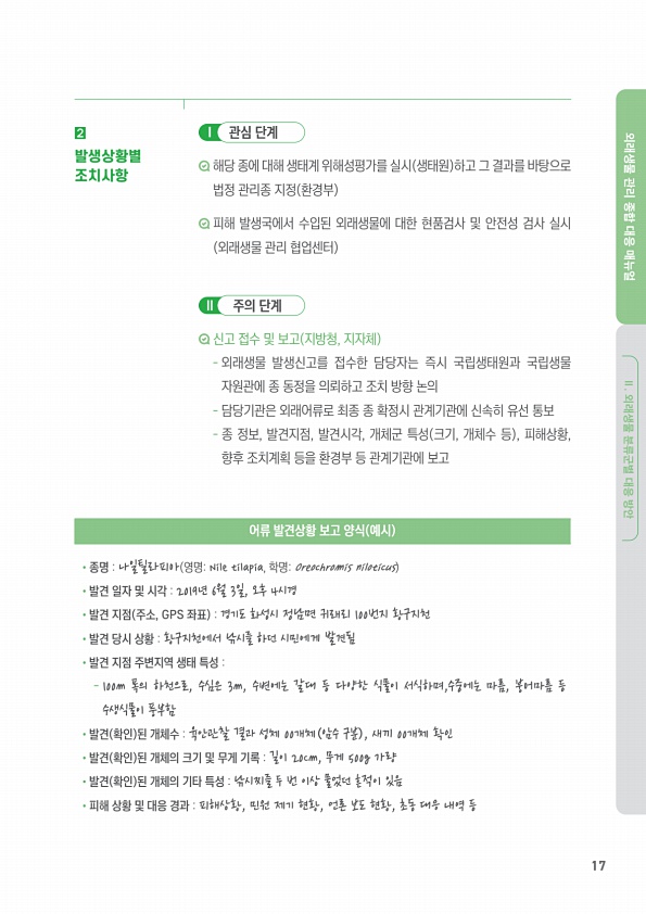 17 외래생물 관리 종합 대응 매뉴얼 Ⅱ. 외래생물 분류군별 대응 방안 ? 해당 종에 대해 생태계 위해성평가를 실시 생태원 하고 그 결과를 바탕으로 법정 관리종 지정 환경부 피해 발생국에서 수입된 외래생물에 대한 현품검사 및 안전성 검사 실시 외래생물 관리 협업센터 신고 접수 및 보고 지방청, 지자체 외래생물 발생신고를 접수한 담당자는 즉시 국립생태원과 국립생물 자원관에 종 동정을 의뢰하고 조치 방향 논의 담당기관은 외래어류로 최종 종 확정시 관계기관에 신속히 유선 통보 종 정보, 발견지점, 발견시각, 개체군 특성 크기, 개체수 등 , 피해상황, 향후 조치계획 등을 환경부 등 관계기관에 보고 I 관심 단계 Ⅱ 주의 단계 어류 발견상황 보고 양식 예시 ?종명 ? 영명, 학명?발견 일자 및 시각 ?발견 지점 주...