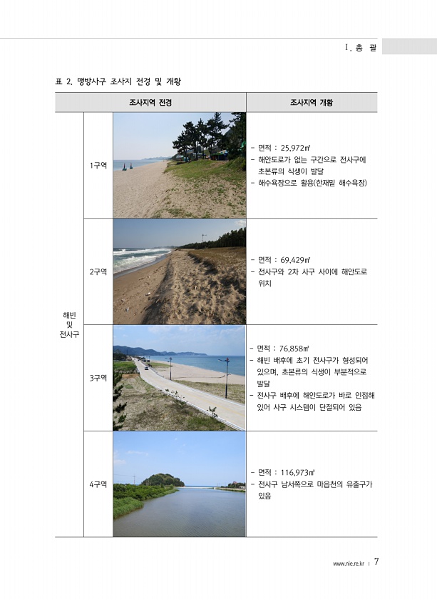 Ⅰ. 총 괄 www.nie.re.kr ? 7 조사지역 전경 조사지역 개황 해빈 및 전사구 1구역 면적 25,972㎡ 해안도로가 없는 구간으로 전사구에 초본류의 식생이 발달 해수욕장으로 활용 한재밑 해수욕장 2구역 면적 69,429㎡ 전사구와 2차 사구 사이에 해안도로 위치 3구역 면적 76,858㎡ 해빈 배후에 초기 전사구가 형성되어 있으며, 초본류의 식생이 부분적으로 발달 전사구 배후에 해안도로가 바로 인접해 있어 사구 시스템이 단절되어 있음 4구역 면적 116,973㎡ 전사구 남서쪽으로 마읍천의 유출구가 있음 표 2. 맹방사구 조사지 전경 및개황