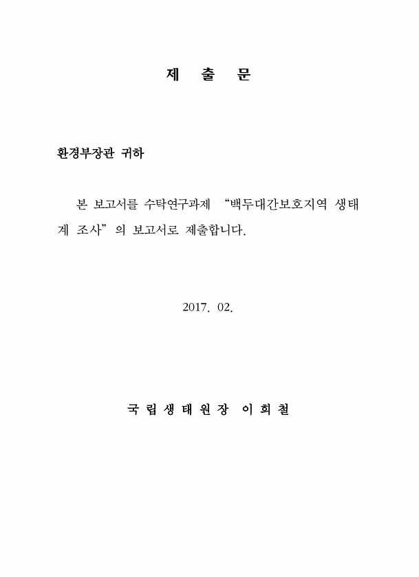 제 출 문 환경부장관 귀하 본 보고서를 수탁연구과제 “백두대간보호지역 생태 계 조사” 의 보고서로 제출합니다. 2017. 02. 국 립 생 태 원 장 이 희철