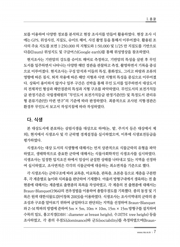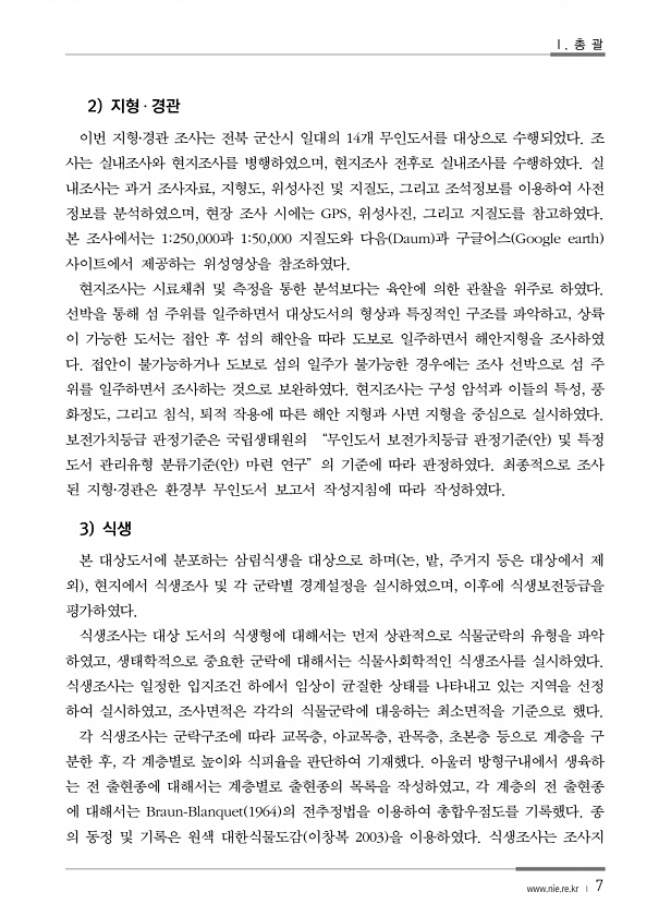 Ⅰ. 총 괄 www.nie.re.kr ? 7 2 지형 ? 경관 이번 지형?경관 조사는 전북 군산시 일대의 14개 무인도서를 대상으로 수행되었다. 조 사는 실내조사와 현지조사를 병행하였으며, 현지조사 전후로 실내조사를 수행하였다. 실 내조사는 과거 조사자료, 지형도, 위성사진 및 지질도, 그리고 조석정보를 이용하여 사전 정보를 분석하였으며, 현장 조사 시에는 GPS, 위성사진, 그리고 지질도를 참고하였다. 본 조사에서는 1250,000과 150,000 지질도와 다음 Daum 과 구글어스 Google earth 사이트에서 제공하는 위성영상을 참조하였다. 현지조사는 시료채취 및 측정을 통한 분석보다는 육안에 의한 관찰을 위주로 하였다. 선박을 통해 섬 주위를 일주하면서 대상도서의 형상과 특징적인 구조를 파악하고,...