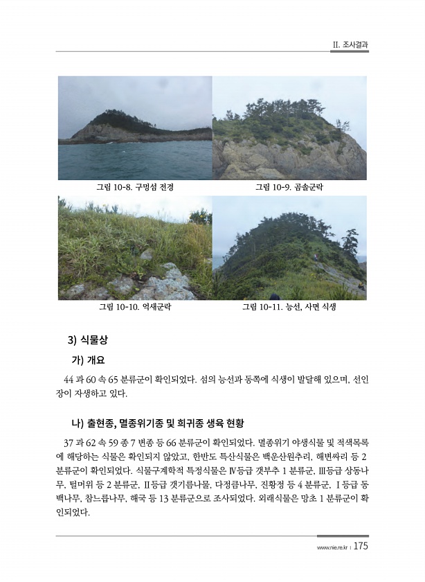 II. 조사결과 www.nie.re.kr ?175 그림 10-8. 구멍섬 전경 그림 10-9. 곰솔군락 그림 10-10. 억새군락 그림 10-11. 능선, 사면 식생 3 44 과 60 속 65 분류군이 확인되었다. 섬의 능선과 동쪽에 식생이 발달해 있으며, 선인 장이 자생하고 있다. , 37 과 62 속 59 종 7 변종 등 66 분류군이 확인되었다. 멸종위기 야생식물 및 적색목록 에 해당하는 식물은 확인되지 않았고, 한반도 특산식물은 백운산원추리, 해변싸리 등 2 분류군이 확인되었다. 식물구계학적 특정식물은 Ⅳ등급 갯부추 1 분류군, Ⅲ등급 상동나 무, 털머위 등 2 분류군, Ⅱ등급 갯기름나물, 다정큼나무, 진황정 등 4 분류군, Ⅰ등급 동 백나무, 참느릅나무, 해국 등 13 분류군으로 조사되었다. 외래식...