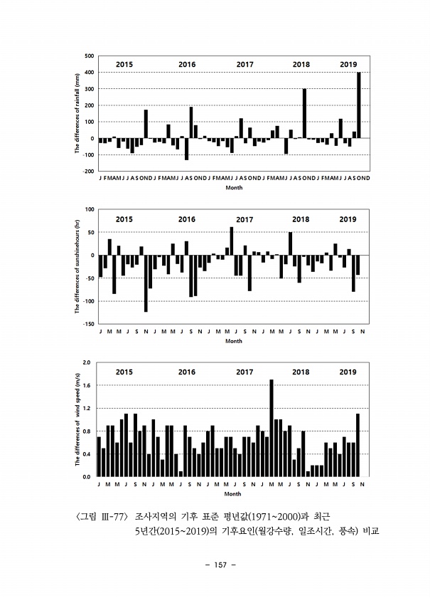 157 그림 Ⅲ-77 조사지역의 기후 표준 평년값 19712000 과 최근 5년간 20152019 의 기후요인 월강수량, 일조시간, 풍속비교