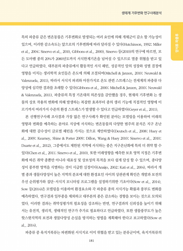181 생태계 기후변화 연구사례분석 양서류·파충류 특히 파충류 같은 변온동물은 기후변화로 발생되는 여러 요인에 의해 개체군이 감소 할 가능성이 있으며, 이러한 감소속도는 앞으로의 기후변화에 따라 달라질 수 있다 Hutchinson, 1992; Miller et al., 2004; Sinervo et al., 2010, Gibbons et al., 2000 Sinervo 등 2010 의 연구에 따르면, 모 든 도마뱀 종의 20%가 2080년도까지 서식한계기온을 넘어설 수 있으므로 멸종 위협을 받고 있 다고 언급하였다. 대부분의 파충류에서 활동적인 서식 패턴, 성공적인 알의 성장와 성별 결정에 영향을 미치는 생리학적 요인들은 온도에 의해 조절되며 Mitchell & Janzen, 2010; Neuwald & V...