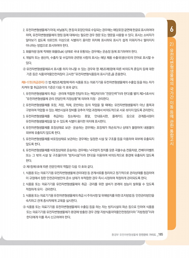 환경부 유전자변형생물체 안전관리 가이드 _185 6 유전자변형생물체의 국가간 이동 등에 관한 통합고시 2 2. 유전자변형생물체가 마대, 비닐봉지, 캔 등의 포장단위로 수입되는 경우에는 해당포장 겉면에 한글로 표시하여야 하며, 유전자변형생물체의 명칭 등에 대해서는 필요한 경우 원문 또는 영문을 사용할 수 있다. 표시는 소비자가 알아보기 쉽도록 10포인트 이상으로 식별하기 용이한 위치에 표시하되 표시가 쉽게 지워지거나 떨어지지 아니하는 방법으로 표시하여야 한다. 3. 화물차량 등에 적재된 화물 Bulk 상태로 국내 유통되는 경우에는 운송장 등에 표기하여야 한다. 4. 개발자 또는 생산자, 수출자 및 수입자와 관련된 사항의 표시는 해당 제품 수출국 생산국 의 언어로 표시할 수 있다. ② 유전자변형생물체로서 표시를...