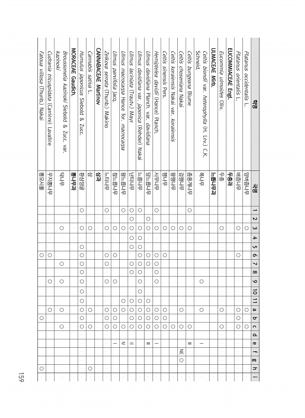 159 학명 국명 1 2 3 4 5 6 7 8 9 10 11 a b c d e f g h i Platanus occidentalis L. 양버즘나무 ○ ○ ○ Platanus orientalis L. 버즘나무 ○ ○ ○ ○ ○ EUCOMMIACEAE Engl. 두충과 Eucommia ulmoides Oliv. 두충 ○ ○ ○ ULMACEAE Mirb. 느릅나무과 Celtis biondii var. heterophylla H. L?v. C.K. Schneid. 폭나무 ○ ○ Ⅰ Celtis bungeana Blume 좀풍게나무 ○ ○ ○ Ⅲ Celtis choseniana Nakai 검팽나무 ○ ○ ○ NE ○ Celtis koraiensis Nakai var. koraiensis 왕팽나무 ○ ○ Celti...