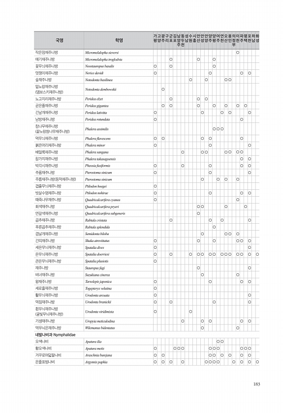 183 작은점재주나방 Micromelalopha sieversi ○ 애기재주나방 Micromelalopha troglodvta ○ ○ ○ 꽃무늬재주나방 Neostauropus basalis ○ ○ ○ 멋쟁이재주나방 Nerice davidi ○ ○ ○ ○ 숲재주나방 Notodonta basilinea ○ ○ ○ ○ 밑노랑재주나방 뎀보스키재주나방 Notodonta dembowskii ○ 노고지리재주나방 Peridea elzet ○ ○ ○ 곧은줄재주나방 Peridea gigantea ○ ○ ○ ○ ○ ○ ○ 긴날개재주나방 Peridea lativitta ○ ○ ○ ○ ○ 남방재주나방 Peridea rotundata ○ ○ 참나무재주나방 끝노랑참나무재주나방 Phalera assimilis ○ ○ ○ 먹무늬재주나방 ...