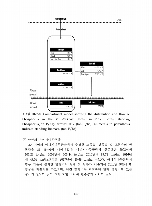 149 그림 Ⅲ-72 Compartment model showing the distribution and flow of Phosphorus in the P. densiflora forest in 2017. Boxesstanding Phosphorus ton P/ha , arrowsflux ton P/ha Numerals in parenthesis indicate standing biomass ton P/ha 3 남산의 아까시나무군락 조사지역의 아까시나무군락에서 추정한 교목층, 관목층 및 초본층의 현 존량을 표 Ⅲ-40에 나타내었다. 아까시나무군락의 현존량은 2008년에 105.26 ton/ha, 2009년에 105.44 ton/ha, 2010년에 87.71 ton/ha, 2016년 에 47.59 ton/ha...