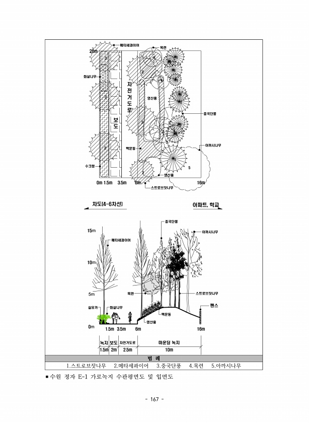 167 자 전 거 도 로 0m 녹지 1.5m 5m 15m 10m 차도 4-6차선 아파트, 학교 0m 1.5m 영산홍 보 도 3.5m 6m 16m 펜스 1.5m 3.5m 6m 16m 자전거도로 2m 보도 2.5m 마운딩 녹지 10m 메타세콰이어 20m 목련 맥문동 스트로브잣나무 화살나무 맥문동 메타세콰이어 중국단풍 목련 스트로브잣나무 수크렁 아까시나무 영산홍 2 2 2 2 2 2 5 3 3 3 1 1 1 1 1 1 1 1 1 4 4 중국단풍 화살나무 실유카 아까시나무 영산홍 범 례 1.스트로브잣나무 2.메타세콰이어 3.중국단풍 4.목련 5.아까시나무 ?수원 정자 E-1 가로녹지 수관평면도 및입면도
