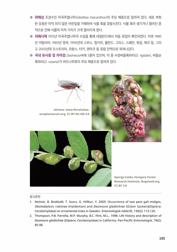 185 ● 위해성 조경수인 미국주엽나무 Gleditsia triacanthos 의 주요 해충으로 알려져 있다. 새로 부화 한 유충은 아직 피지 않은 어린잎을 가해하여 식물 혹을 유발시킨다. 식물 혹이 생기거나 떨어진 흔 적으로 인해 식물의 미적 가치가 크게 떨어지게 된다. ● 피해사례 1975년 미국주엽나무의 수입을 통해 네덜란드에서 처음 유입이 확인되었다. 이후 1980 년 이탈리아, 1983년 영국, 1990년대 스위스, 헝가리, 폴란드, 그리스, 스페인, 독일, 체코 등, 그리 고 2000년대 오스트리아, 프랑스, 터키, 덴마크 등 유럽 전역으로 퍼져나갔다. ● 국내 유사종 및 차이점 Dasineura속에 5종이 있으며, 이 중 수양버들혹파리 D. rigidae , 버들순 혹파리 D. rosaria 가...