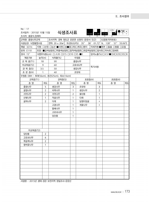 Ⅱ. 조사결과 www.nie.re.kr ? 173 No 17 조사일자 2015년 10월 15일 조사자홍용식,장래하 식생조사표 군락명졸참나무군락 조사지역경북 청도군 운문면 신원리 운문사 인근 도엽명 격자번호 식생상관낙엽활엽수림 면적20 x 20㎡ 위?경도 GPS 35° 38′ 01.72″N, 128° 57′ 33.06E 해발327m 지형□산정 □능선 ■사면 □상■중□하 □계곡□평지 미세지형■평면 □돌출 □함몰 □요철 방위E110 토양■갈색삼림토□적황색삼림토□암적색삼림토□회갈색삼림토□침식토□미숙토□암쇄토 경사15° 낙엽부식층 cm □.≥20 □ 15 □ 10 □ 5 ■0 암석노출 % □≥51■ 50□ 25□ 5□0 계층구분 높이 m 식피율 % 우점종 특기사항교 목 층 T1 18 90 졸참나무 아교목층 T2 9 ...