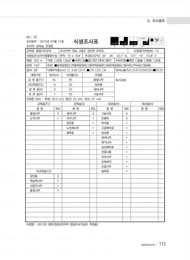 Ⅱ. 조사결과 www.nie.re.kr ? 173 No 22 조사일자 2015년 07월 11일 조사자김하송, 조영준 식생조사표 군락명졸참나무군락 조사지역전남 고흥군 금산면 오천리 도엽명 격자번호 12 식생상관산지낙엽활엽수림 면적10 x 10㎡ 위?경도 GPS 34° 26′ 52.7″N, 127° 10′ 53.8″E 해발322 m 지형□산정 □능선 ■사면 □상■중□하 □계곡□평지 미세지형■평면 □돌출 □함몰 □요철 방위150° 토양■갈색삼림토□적황색삼림토□암적색삼림토□회갈색삼림토□침식토□미숙토□암쇄토 경사28° 낙엽부식층 cm □ ≥20 □ 15 ■ 10 □ 5 □0 암석노출 % □≥51□ 50□ 25■ 5□0 계층구분 높이 m 식피율 % 우점종 교 목 층 T1 16 95 졸참나무 특기사항아교목층 T2 6 2...