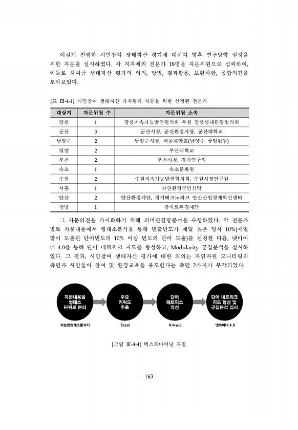 163 이렇게 진행한 시민참여 생태자산 평가에 대하여 향후 연구방향 설정을 위한 자문을 실시하였다. 각 지자체의 전문가 18명을 자문위원으로 섭외하여, 이들로 하여금 생태자산 평가의 의의, 방법, 결과활용, 보완사항, 종합의견을 모아보았다. 대상지 자문위원 수 자문위원 소속 강릉 1 강릉지속가능발전협의회 부설 강릉생태관광협의회 군산 3 군산시청, 군산환경사랑, 군산대학교 남양주 2 남양주시청, 서울대학교 남양주 상임위원 밀양 2 부산대학교 부천 2 부천시청, 경기연구원 속초 1 속초문화원 수원 2 수원지속가능발전협의회, 수원시정연구원 시흥 1 자연환경국민신탁 안산 2 안산환경재단, 경기테크노파크 안산산업경제혁신센터 창녕 1 람사르환경재단 [표 Ⅲ-4-1] 시민참여 생태자산 가치평가 자문을 위한 선정된 전문가...
