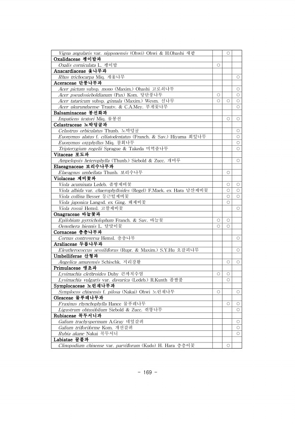 169 Vigna angularis var. nipponensis Ohwi Ohwi & H.Ohashi 새팥 ○ Oxalidaceae 괭이밥과 Oxalis corniculata L. 괭이밥 ○ Anacardiaceae 옻나무과 Rhus trichocarpa Miq. 개옻나무 ○ Aceraceae 단풍나무과 Acer pictum subsp. mono Maxim. Ohashi 고로쇠나무 ○ Acer pseudosieboldianum Pax Kom. 당단풍나무 ○ ○ Acer tataricum subsp. ginnala Maxim. Wesm. 신나무 ○ ○ ○ Acer ukurunduense Trautv. & C.A.Mey. 부게꽃나무 ○ Balsaminaceae 봉선화과 Impatiens textori Miq....