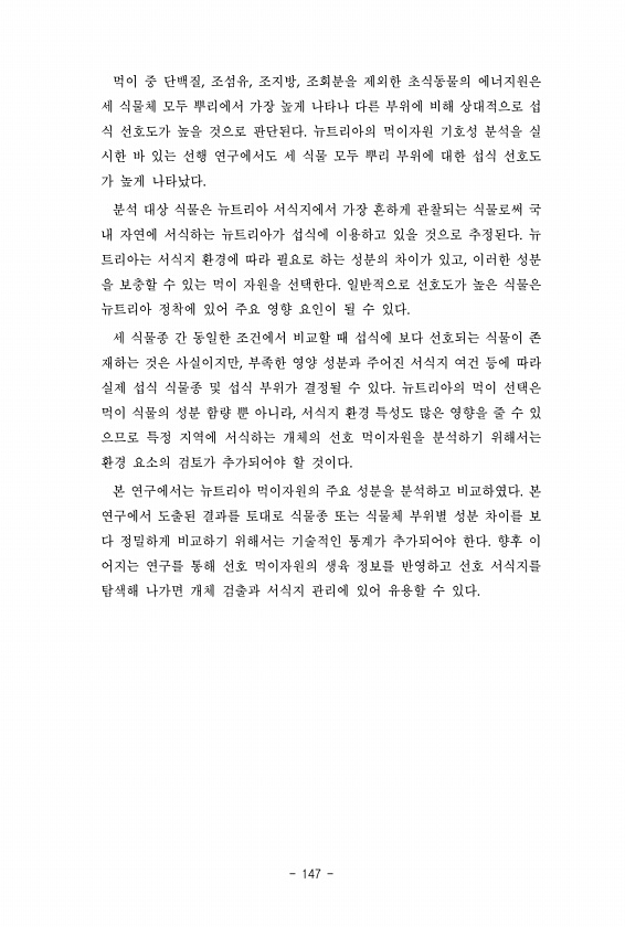먹이 중 단백질, 조섬유, 조지방, 조회분을 제외한 초식동물의 에너지원은 세 식물체 모두 뿌리에서 가장 높게 나타나 다른 부위에 비해 상대적으로 섭 식 선호도가 높을 것으로 판단된다. 뉴트리아의 먹이자원 기호성 분석을 실 시한 바 있는 선행 연구에서도 세 식물 모두 뿌리 부위에 대한 섭식 선호도 가 높게 나타났다. 분석 대상 식물은 뉴트리아 서식지에서 가장 흔하게 관찰되는 식물로써 국 내 자연에 서식하는 뉴트리아가 섭식에 이용하고 있을 것으로 추정된다. 뉴 트리아는 서식지 환경에 따라 필요로 하는 성분의 차이가 있고, 이러한 성분 을 보충할 수 있는 먹이 자원을 선택한다. 일반적으로 선호도가 높은 식물은 뉴트리아 정착에 있어 주요 영향 요인이 될 수 있다. 세 식물종 간 동일한 조건에서 비교할 때 섭식에 보...