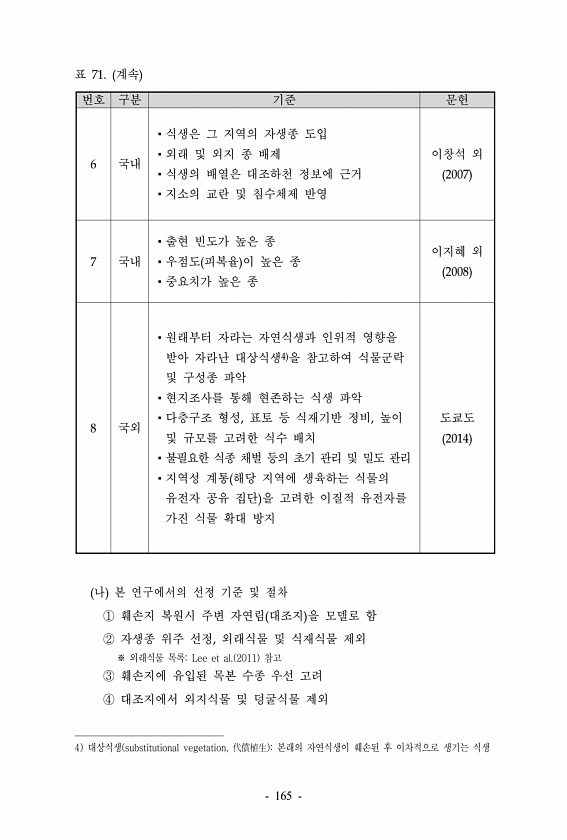 표 71. 계속 번호 구분 기준 문헌 6 국내 ?식생은 그 지역의 자생종 도입 ?외래 및 외지 종 배제 ?식생의 배열은 대조하천 정보에 근거 ?지소의 교란 및 침수체제 반영 이창석 외 2007 7 국내 ?출현 빈도가 높은 종 ?우점도 피복율 이 높은 종 ?중요치가 높은 종 이지혜 외 2008 8 국외 ?원래부터 자라는 자연식생과 인위적 영향을 받아 자라난 대상식생4 을 참고하여 식물군락 및 구성종 파악 ?현지조사를 통해 현존하는 식생 파악 ?다층구조 형성, 표토 등 식재기반 정비, 높이 및 규모를 고려한 식수 배치 ?불필요한 식종 채벌 등의 초기 관리 및 밀도 관리 ?지역성 계통 해당 지역에 생육하는 식물의 유전자 공유 집단 을 고려한 이질적 유전자를 가진 식물 확대 방지 도쿄도 2014 나 본 연구에서의 ...