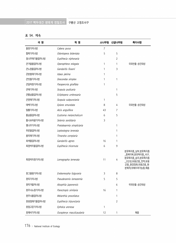 2017 백두대간 생태계 정밀조사 구룡산 고정조사구 176 ? National Institute of Ecology 표 54. 계속 국 명 학 명 소나무림 신갈나무림 특이사항 줄흰가지나방 Cabera purus 7 짤룩가지나방 Odontopera bidentata 5 5 참나무애기물결자나방 Eupithecia niphonaria 2 큰겨울물결자나방 Operophtera relegata 1 1 국외반출 승인대상 큰노랑물결자나방 Gandaritis fixseni 1 3 큰분홍애기자나방 Idaea jakima 1 큰빗줄가지나방 Descoreba simplex 1 1 큰알락흰가지나방 Parapercnia giraffata 1 큰애기자나방 Scopula pudicaria 1 큰톱날물결자나방 Ecliptopera um...