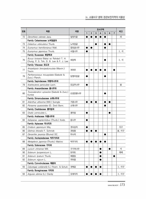 iv. 소황사구 생태·경관보전지역의 식물상 www.nie.re.kr ?173 번호 학명 국명 조사구역 비고 1 2 3 4 5 6 7 72 Oenothera odorata Jacq. 달맞이꽃 ● ● ● ● ● 외 Family Celastraceae 노박덩굴과 73 Celastrus orbiculatus Thunb. 노박덩굴 ● ● ● 74 Euonymus hamiltonianus Wall. 참빗살나무 ● ● ● 75 Euonymus japonicus Thunb. 사철나무 ● Ⅰ, 식 Family Buxaceae 회양목과 76 Buxus koreana Nakai ex Rehder T. H. Chung, P. S. Toh, D. B. Lee & F. J. Lee 회양목 ● Ⅰ, 식 Family Vitaceae 포...