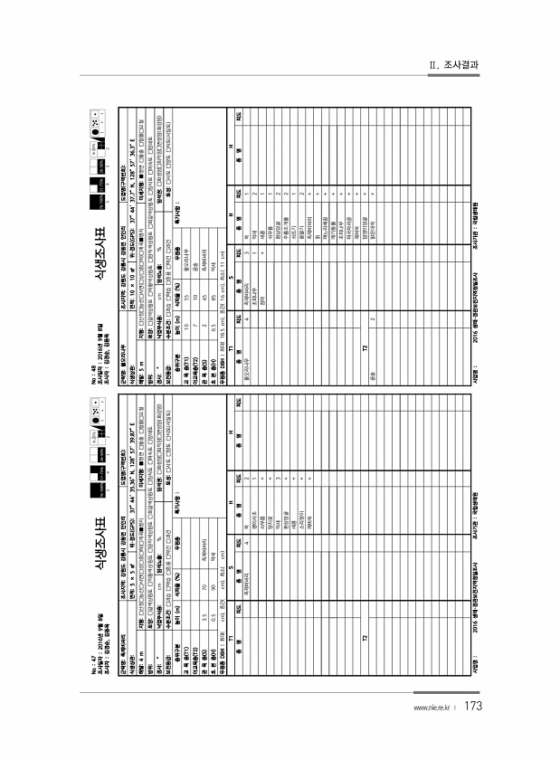 173 No 47 조사일자 2016년 9월 8일 조사자 김경순, 김동욱 식생조사표 군락명족제비싸리 조사지역강원도 강릉시 강동면 안인리 도엽명 구역번호 식생상관면적5 × 5 ㎡ 위·경도 GPS 37°44′35.36″N, 128°57′39.87″E 해발4 m 지형□산정□능선□사면 □상□중□하 □계곡■평지 미세지형■평면 □돌출 □함몰□요철 방위토양□갈색삼림토 □적황색삼림토 □암적색삼림토 □회갈색삼림토 □침식토 □미숙토 □암쇄토 경사° 낙엽부식층cm 암석노출% 암석권□화성암□퇴적암□변성암 화강암 보전등급수분조건□과습 □약습 □중용 □약건 □과건 토성□사토 □양토 □식토 사질토 층위구분 높이 m 식피율 % 우점종 특기사항 교 목 층 T1 아교목층 T2 관 목 층 S 3.5 70 족제비싸리 초 본 층 H 0.5 90 ...