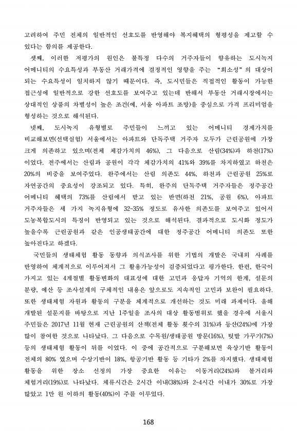168 고려하여 주민 전체의 일반적인 선호도를 반영해야 복지혜택의 형평성을 제고할 수 있다는 함의를 제공한다. 셋째, 이러한 저평가의 원인은 불특정 다수의 거주자들이 향유하는 도시녹지 어메니티의 수요특성과 부동산 거래가격에 결정적인 영향을 주는 “희소성”의 대상이 되는 수요특성이 일치하지 않기 때문이다. 즉, 도시민들은 직접적인 활동이 가능한 접근성에 일반적으로 강한 선호도를 보여주고 있는데 반해서 부동산 거래시장에서는 상대적인 상품의 차별성이 높은 조건 예, 서울 아파트 조망 을 중심으로 가격 프리미엄을 형성하는 것으로 해석된다. 넷째, 도시녹지 유형별로 주민들이 느끼고 있는 어메니티 경제가치를 비교해보면 선택실험 서울에서는 아파트와 단독주택 거주자 모두가 근린공원에 가장 크게 의존하고 있으며 전체 체감가...