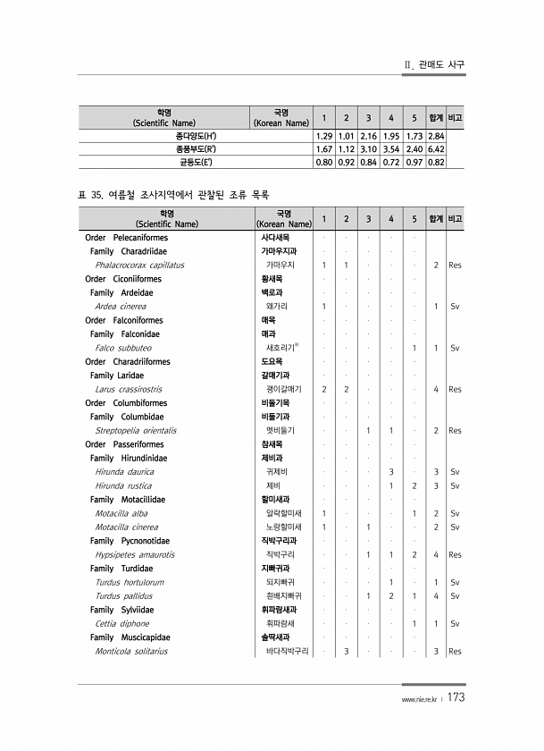 Ⅱ. 관매도 사구 www.nie.re.kr ? 173 학명 Scientific Name 국명 Korean Name 1 2 3 4 5 합계 비고 종다양도 H1.29 1.01 2.16 1.95 1.73 2.84 종풍부도 R1.67 1.12 3.10 3.54 2.40 6.42 균등도 E0.80 0.92 0.84 0.72 0.97 0.82 학명 Scientific Name 국명 Korean Name 1 2 3 4 5 합계 비고 Order Pelecaniformes 사다새목 Family Charadriidae 가마우지과 Phalacrocorax capillatus 가마우지 1 1 2 Res Order Ciconiiformes 황새목 Family Ardeidae 백로과 Ardea cinerea 왜가리 1 ...