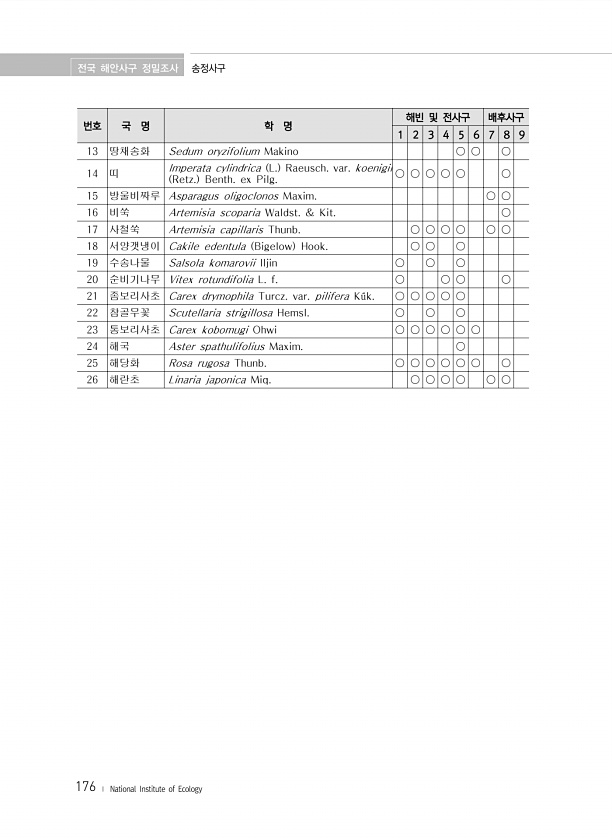 전국 해안사구 정밀조사 송정사구 176 ? National Institute of Ecology 번호 국 명 학 명 해빈 및 전사구 배후사구 1 2 3 4 5 6 7 8 9 13 땅채송화 Sedum oryzifolium Makino ○ ○ ○ 14 띠 Imperata cylindrica L. Raeusch. var. koenigii Retz. Benth. ex Pilg. ○ ○ ○ ○ ○ ○ 15 방울비짜루 Asparagus oligoclonos Maxim. ○ ○ 16 비쑥 Artemisia scoparia Waldst. & Kit. ○ 17 사철쑥 Artemisia capillaris Thunb. ○ ○ ○ ○ ○ ○ 18 서양갯냉이 Cakile edentula Bigelow Hook. ○ ○ ○ 19 ...