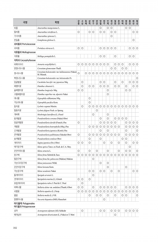 182 비름 Amaranthus mangostanus L. ○ ○ ○ ○ ○ 털비름 Amaranthus retrofexus L. ○ ○ ○ ○ ○ ○ ○ ○ ○ 가시비름 Amaranthus spinosus L. ○ 천일홍 Gomphrena globosa L. ○ 쇠비름과 Portulacaceae 쇠비름 Portulaca oleracea L. ○ ○ ○ ○ ○ ○ ○ ○ ○ ○ 석류풀과 Molluginaceae 석류풀 Mollugo pentaphylla L. ○ ○ ○ ○ ○ 석죽과 Caryophyllaceae 벼룩이자리 Arenaria serpyllifolia L. ○ ○ ○ ○ ○ ○ ○ ○ ○ ○ ○ ○ ○ ○ ○ 양점나도나물 Cerastium glomeratum Thuill. ○ ○ ○ ○ 점나도나물 ...