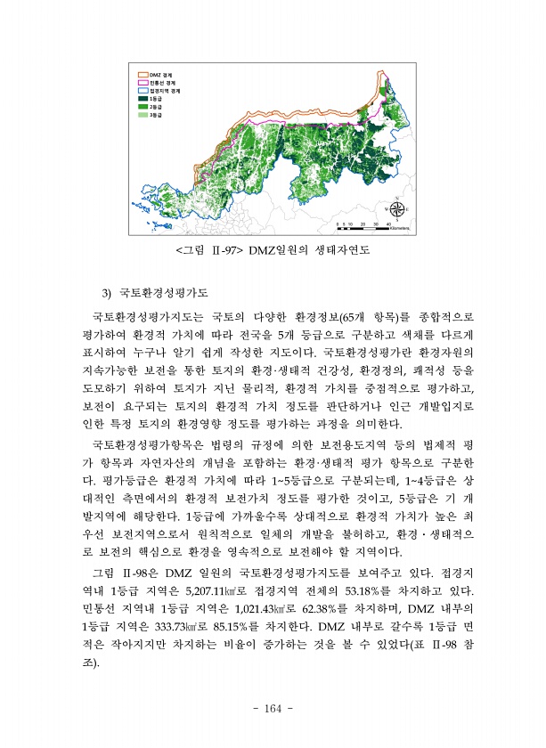 164 그림 일원의 생태자연도 국토환경성평가도 국토환경성평가지도는 국토의 다양한 환경정보 개 항목 를 종합적으로 평가하여 환경적 가치에 따라 전국을 개 등급으로 구분하고 색채를 다르게 표시하여 누구나 알기 쉽게 작성한 지도이다 국토환경성평가란 환경자원의 지속가능한 보전을 통한 토지의 환경 생태적 건강성 환경정의 쾌적성 등을 도모하기 위하여 토지가 지닌 물리적 환경적 가치를 중점적으로 평가하고 보전이 요구되는 토지의 환경적 가치 정도를 판단하거나 인근 개발입지로 인한 특정 토지의 환경영향 정도를 평가하는 과정을 의미한다 국토환경성평가항목은 법령의 규정에 의한 보전용도지역 등의 법제적 평 가 항목과 자연자산의 개념을 포함하는 환경 생태적 평가 항목으로 구분한 다 평가등급은 환경적 가치에 따라 등급으로 구분되는데...