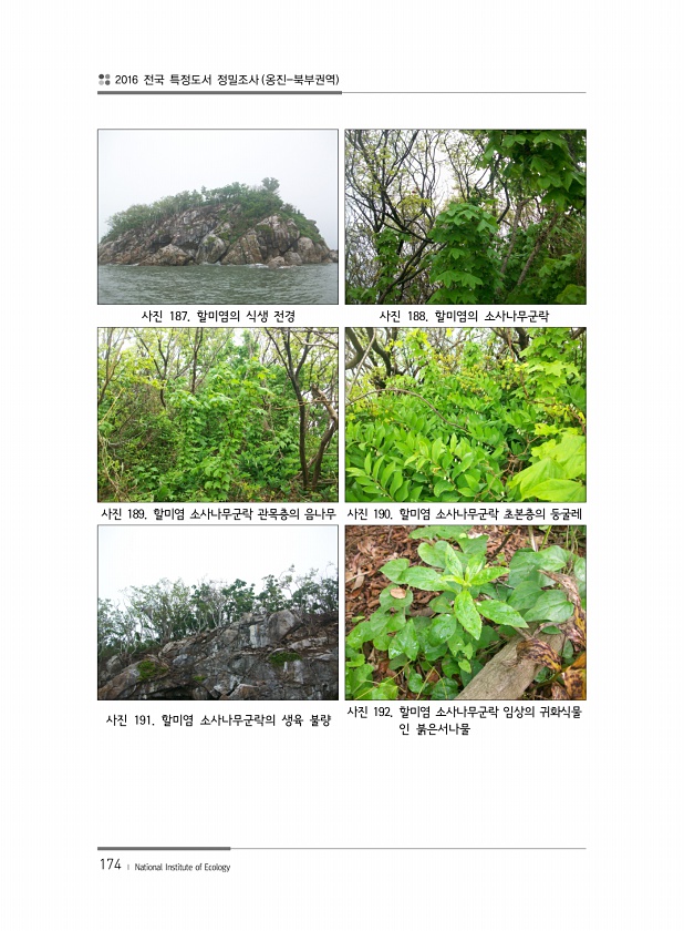 2016 전국 특정도서 정밀조사 옹진-북부권역 174 ? National Institute of Ecology 사진 187. 할미염의 식생 전경 사진 188. 할미염의 소사나무군락 사진 189. 할미염 소사나무군락 관목층의 음나무 사진 190. 할미염 소사나무군락 초본층의 둥굴레 사진 191. 할미염 소사나무군락의 생육 불량 사진 192. 할미염 소사나무군락 임상의 귀화식물 인붉은서나물