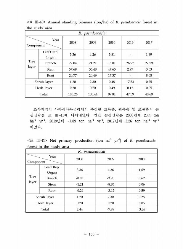 150 표 Ⅲ-40 Annual standing biomass ton/ha of R. pseudoacacia forest in the study area R. pseudoacacia Year Component 2008 2009 2010 2016 2017 Tree layer Leaf+Rep. Organ 3.36 4.26 3.81 1.69 Branch 22.04 21.21 18.01 26.97 27.59 Stem 57.69 56.48 47.65 2.97 3.03 Root 20.77 20.49 17.37 8.08 Shrub layer 1.20 2.30 0.48 17.53 0.25 Herb layer 0.20 0.70 0.49 0.12 0.05 Total 105.26 105.44 87.81 47.59 40.69 조...