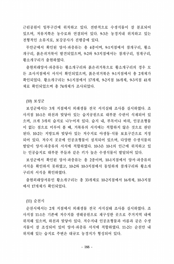 166 근린공원이 일부구간에 위치하고 있다. 전반적으로 수생식물이 잘 분포되어 있으며, 저류지쪽은 농수로와 연결되어 있다. 9-3은 농경지내 위치하고 있는 전형적인 소류지로, 보강공사가 진행중에 있다. 무안군에서 확인된 양서·파충류는 총 4종이며, 9-1지점에서 참개구리, 황소 개구리, 붉은귀거북이 발견되었으며, 9-2와 9-3지점에서는 참개구리, 청개구리, 황소개구리가 출현하였다. 출현외래양서·파충류는 황소개구리와 붉은귀거북으로 황소개구리의 경우 모 든 조사지점에서 서식이 확인되었으며, 붉은귀거북은 9-1지점에서 총 2개체가 확인되었다. 황소개구리는 9-1지점에서 17개체, 9-2지점 16개체, 9-3지점 41개 체로 확인되었으며 총 74개체가 조사되었다. 10 보성군 보성군에서는 3개 지점에서 외래생물 ...