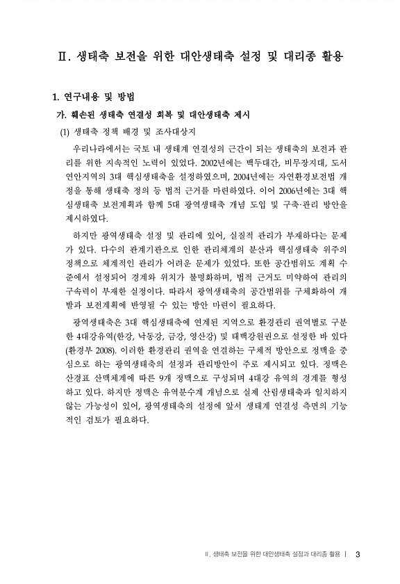 3 생태축 보전을 위한 대안생태축 설정 및 대리종 활용 연구내용 및 방법 가 훼손된 생태축 연결성 회복 및 대안생태축 제시 생태축 정책 배경 및 조사대상지 우리나라에서는 국토 내 생태계 연결성의 근간이 되는 생태축의 보전과 관 리를 위한 지속적인 노력이 있었다 년에는 백두대간 비무장지대 도서 연안지역의 대 핵심생태축을 설정하였으며 년에는 자연환경보전법 개 정을 통해 생태축 정의 등 법적 근거를 마련하였다 이어 년에는 대 핵 심생태축 보전계획과 함께 대 광역생태축 개념 도입 및 구축 관리 방안을 제시하였다 하지만 광역생태축 설정 및 관리에 있어 실질적 관리가 부재하다는 문제 가 있다 다수의 관계기관으로 인한 관리체계의 분산과 핵심생태축 위주의 정책으로 체계적인 관리가 어려운 문제가 있었다 또한 공간범위도 계획...
