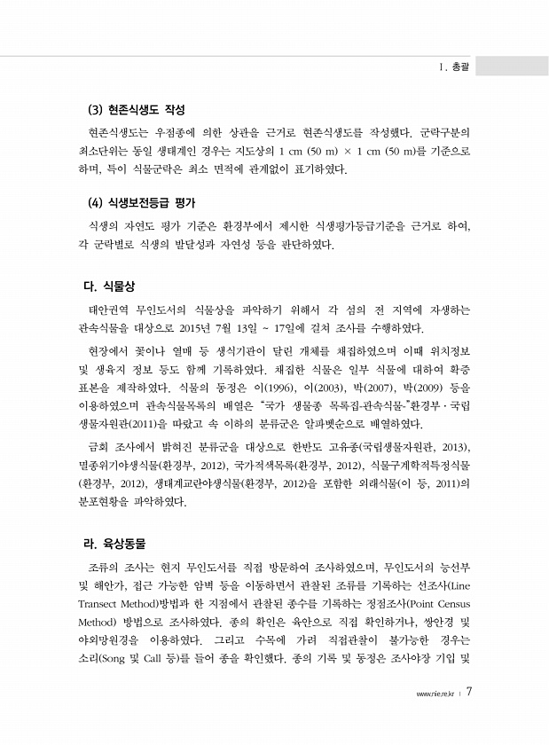 Ⅰ. 총괄 www.nie.re.kr ? 7 3 현존식생도 작성 현존식생도는 우점종에 의한 상관을 근거로 현존식생도를 작성했다. 군락구분의 최소단위는 동일 생태계인 경우는 지도상의 1 cm 50 m × 1 cm 50 m 를 기준으로 하며, 특이 식물군락은 최소 면적에 관계없이 표기하였다. 4 식생보전등급 평가 식생의 자연도 평가 기준은 환경부에서 제시한 식생평가등급기준을 근거로 하여, 각 군락별로 식생의 발달성과 자연성 등을 판단하였다. 다. 식물상 태안권역 무인도서의 식물상을 파악하기 위해서 각 섬의 전 지역에 자생하는 관속식물을 대상으로 2015년 7월 13일 17일에 걸쳐 조사를 수행하였다. 현장에서 꽃이나 열매 등 생식기관이 달린 개체를 채집하였으며 이때 위치정보 및 생육지 정보 등도 함께 기록하였다....