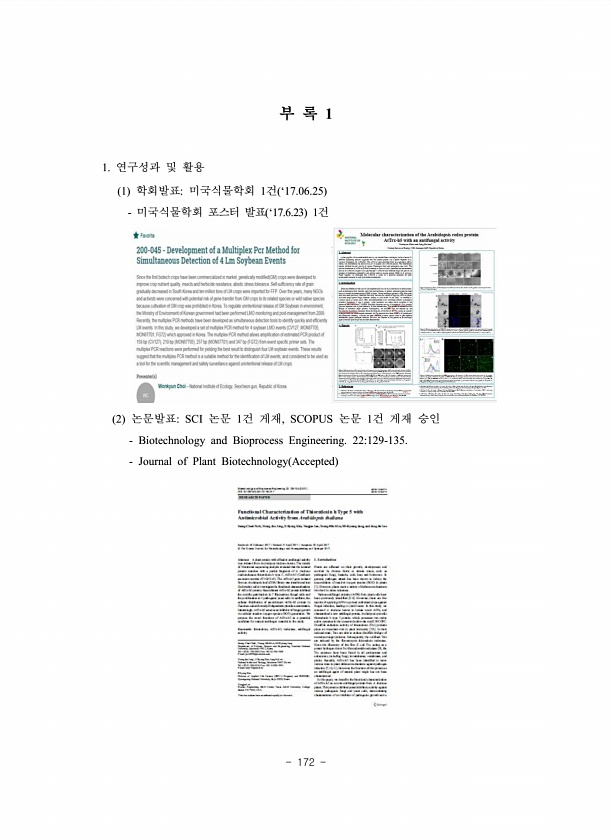 172 부 록 1 1. 연구성과 및 활용 1 학회발표미국식물학회 1건 ‘17.06.25 미국식물학회 포스터 발표 ‘17.6.23 1건 2 논문발표SCI 논문 1건 게재, SCOPUS 논문 1건 게재 승인 Biotechnology and Bioprocess Engineering. 22129-135. Journal of Plant Biotechnology Accepted