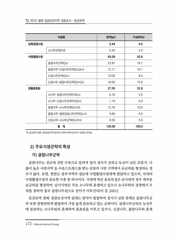 2018 생태·경관보전지역 정밀조사 동강유역 172 ? National Institute of Ecology 식생형 면적 ㎢ 구성비 % 상록침엽수림 5.44 4.5 소나무군락 Pd 5.44 4.5 낙엽활엽수림 63.09 52.6 굴참나무군락 Qv 22.87 19.1 굴참나무-신갈나무군락 QvQm 12.17 10.1 신갈나무군락 Qm 10.03 8.4 신갈나무-굴참나무군락 QmQv 18.03 15.0 침활혼효림 27.35 22.8 소나무-굴참나무군락 PdQv 6.78 5.6 소나무-신갈나무군락 PdQm 1.10 0.9 굴참나무-소나무군락 QvPd 12.76 10.6 굴참나무-일본잎갈나무군락 QvLl 0.66 0.5 신갈나무-소나무군락 QmPd 6.04 5.0 합 계 120.00 100.0 주 동강유역 생태·경...
