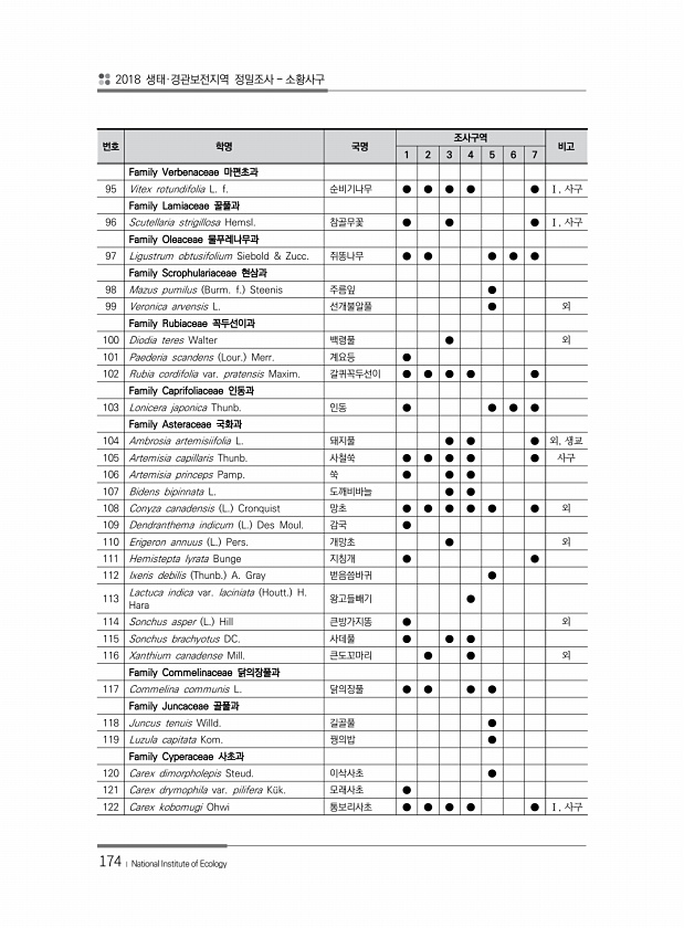 2018 생태·경관보전지역 정밀조사 소황사구 174 ? National Institute of Ecology 번호 학명 국명 조사구역 비고 1 2 3 4 5 6 7 Family Verbenaceae 마편초과 95 Vitex rotundifolia L. f. 순비기나무 ● ● ● ● ● Ⅰ, 사구 Family Lamiaceae 꿀풀과 96 Scutellaria strigillosa Hemsl. 참골무꽃 ● ● ● Ⅰ, 사구 Family Oleaceae 물푸레나무과 97 Ligustrum obtusifolium Siebold & Zucc. 쥐똥나무 ● ● ● ● ● Family Scrophulariaceae 현삼과 98 Mazus pumilus Burm. f. Steenis 주름잎 ● 99 Veronica ar...