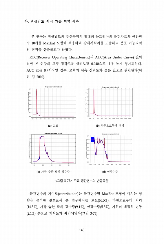 라. 경상남도 서식 가능 지역 예측 본 연구는 경상남도와 부산광역시 일대의 뉴트리아의 출현자료와 공간변 수 10개를 MaxEnt 모형에 적용하여 잠재서식지를 도출하고 분포 가능지역 의 면적을 산출하고자 하였다. ROC Receiver Operating Characteristic 의 AUC Area Under Curve 값의 의한 본 연구의 모형 정확도를 살펴보면 0.940으로 매우 높게 평가되었다. AUC 값은 0.7이상일 경우, 모형의 예측 신뢰도가 높은 값으로 판단된다 이 와 김 2010 a 고도 b 하천으로부터 거리 c 가장 습한 달의 강수량 d 연강수량 ? ? ? ?? 공간변수의 기여도 contribution 는 공간변수별 MaxEnt 모형에 미치는 영 향을 분석한 값으로써 본 연구에서는 고도 65....