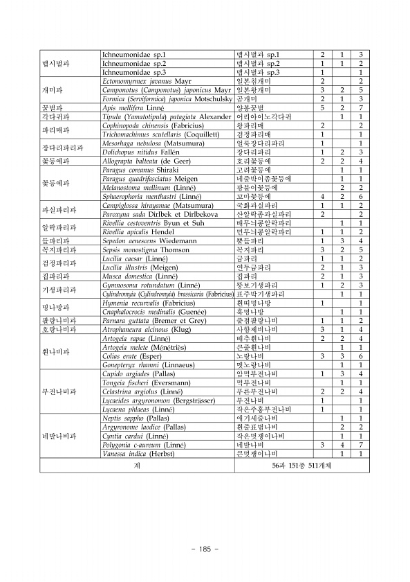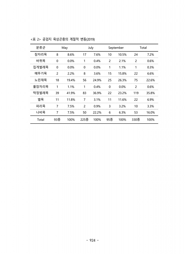 924 분류군 May July September Total 잠자리목 8 8.6% 17 7.6% 10 10.5% 24 7.2% 바퀴목 0 0.0% 1 0.4% 2 2.1% 2 0.6% 집게벌레목 0 0.0% 0 0.0% 1 1.1% 1 0.3% 메뚜기목 2 2.2% 8 3.6% 15 15.8% 22 6.6% 노린재목 18 19.4% 56 24.9% 25 26.3% 75 22.6% 풀잠자리목 1 1.1% 1 0.4% 0 0.0% 2 0.6% 딱정벌레목 39 41.9% 83 36.9% 22 23.2% 119 35.8% 벌목 11 11.8% 7 3.1% 11 11.6% 22 6.9% 파리목 7 7.5% 2 0.9% 3 3.2% 10 3.3% 나비목 7 7.5% 50 22.2% 6 6.3% 53 16.0% Total...