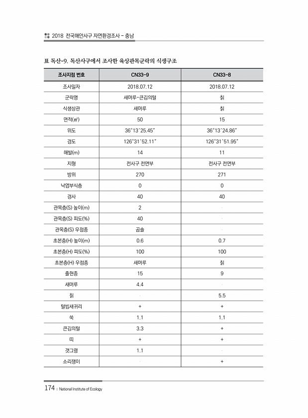 2018 전국해안사구 자연환경조사 충남 174 ? National Institute of Ecology 조사지점 번호 CN33-9 CN33-8 조사일자 2018.07.12 2018.07.12 군락명 새머루-큰김의털 칡 식생상관 새머루 칡 면적 ㎡ 50 15 위도 36°13′25.45″ 36°13′24.86″ 경도 126°31′52.11″ 126°31′51.95″ 해발 m 14 11 지형 전사구 전면부 전사구 전면부 방위 270 271 낙엽부식층 0 0 경사 40 40 관목층 S 높이 m 2 관목층 S 피도 % 40 관목층 S 우점종 곰솔 초본층 H 높이 m 0.6 0.7 초본층 H 피도 % 100 100 초본층 H 우점종 새머루 칡 출현종 15 9 새머루 4.4 칡 5.5 털빕새귀리 + +...
